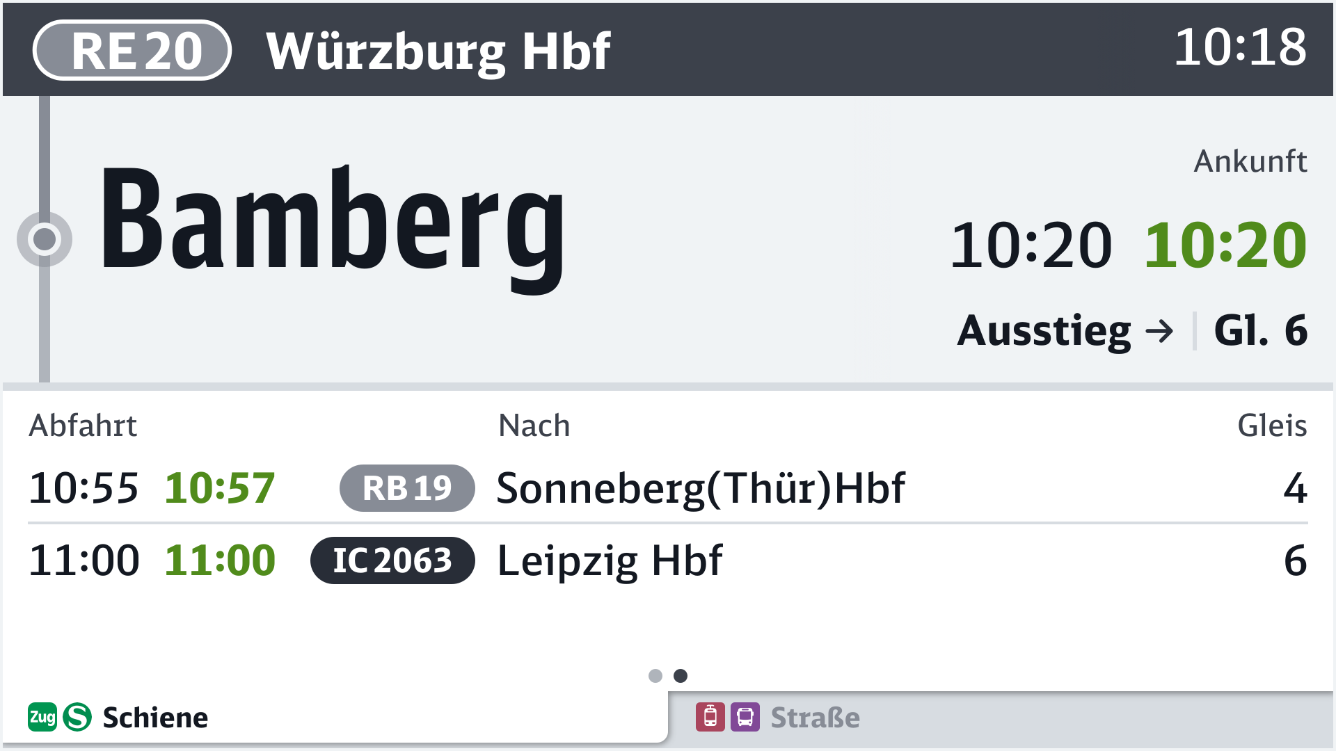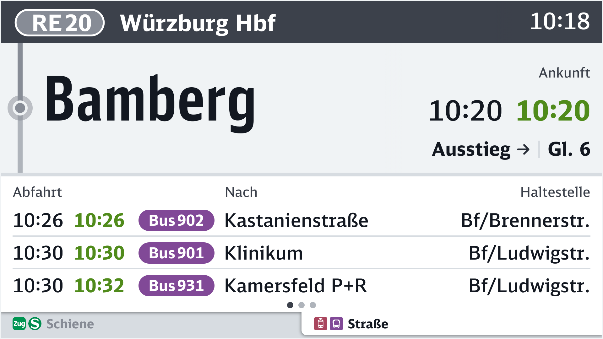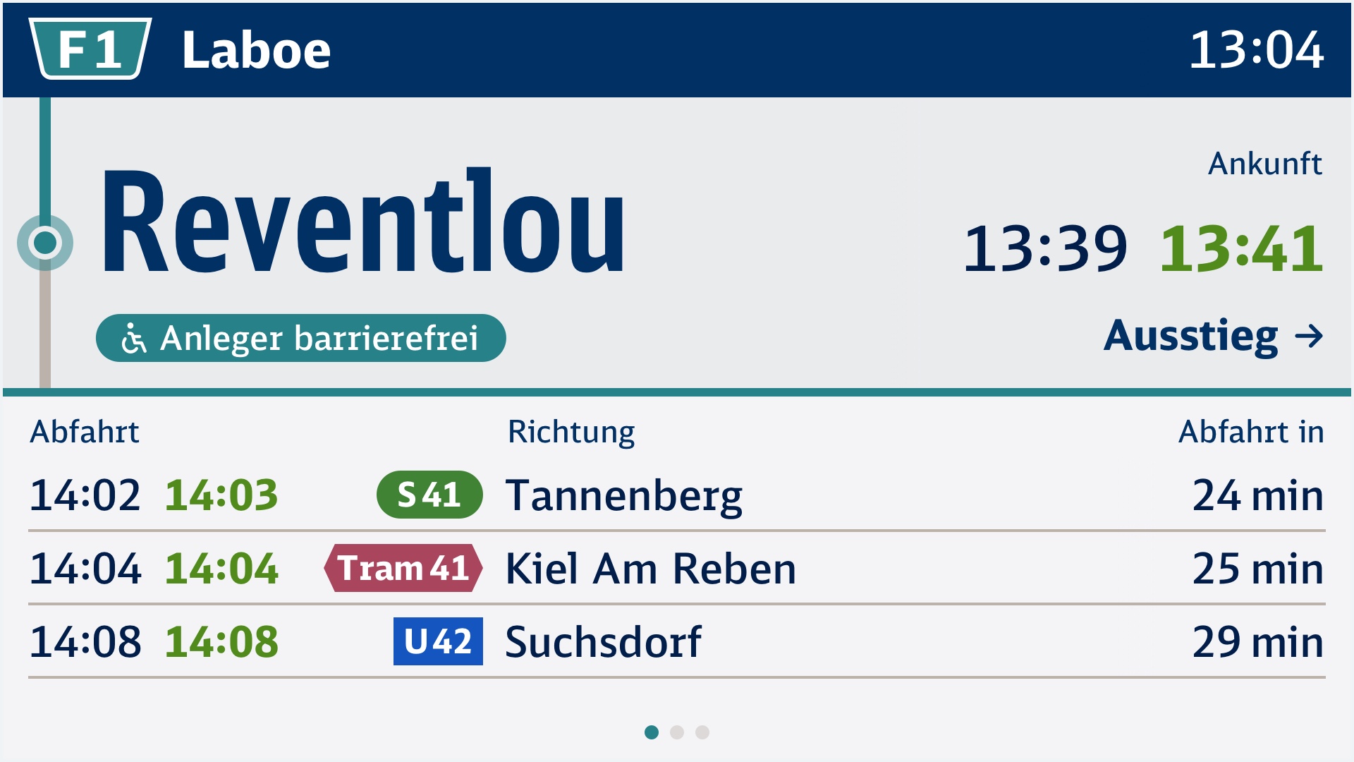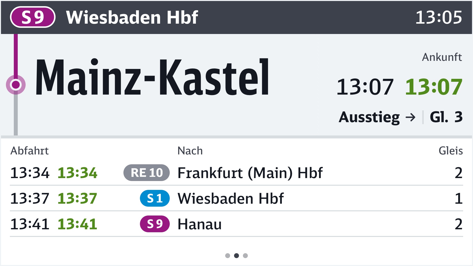 Die verbleibende Zeit bis zur Abfahrt erspart dem Betrachter das Errechnen der Umsteigezeit. Die hier verwendeten Liniensignets sind zusätzlich zu den Produktfarben formunterscheidbar. Dies erhöht die barrierefreie Lesbarkeit des Designs.