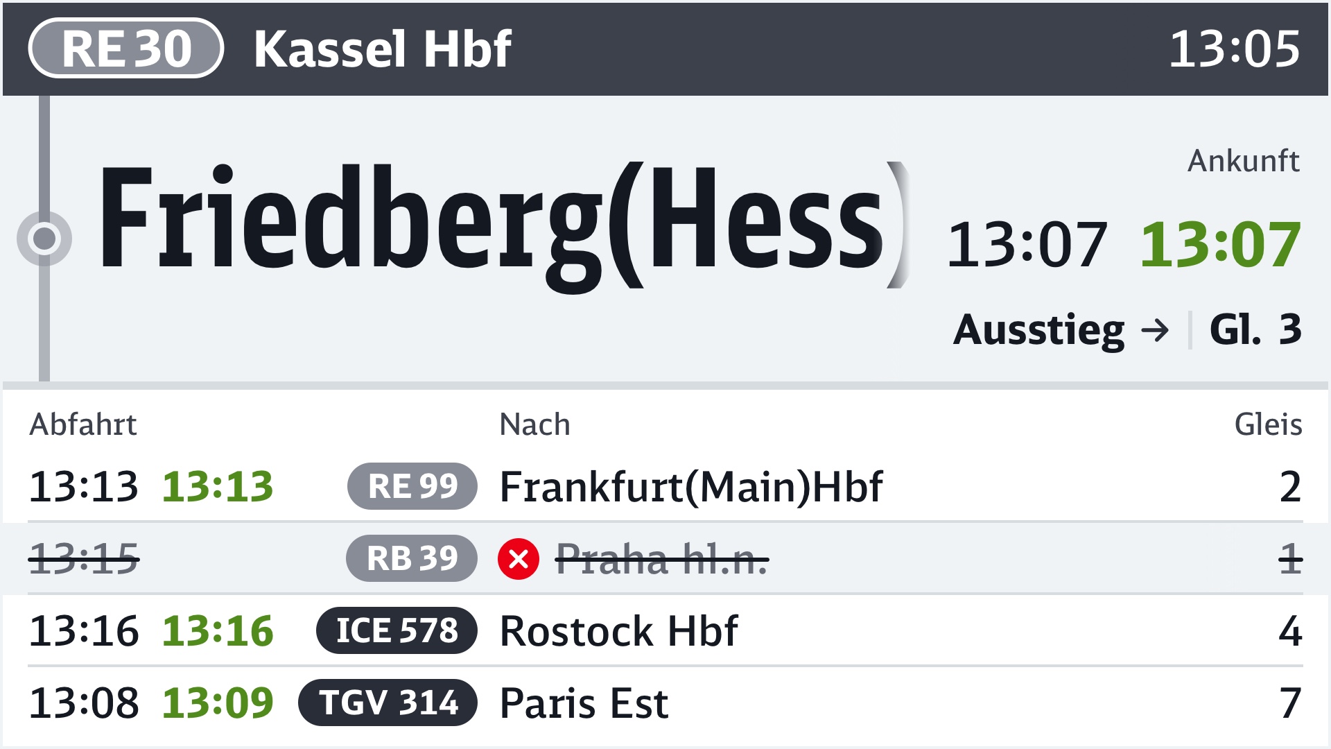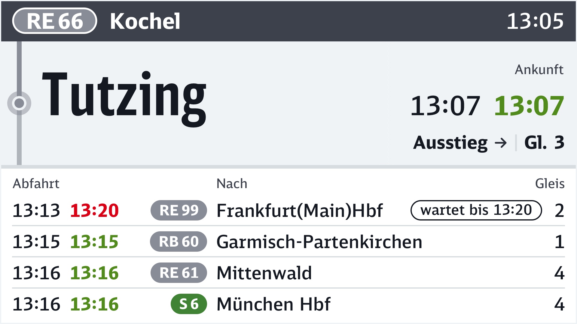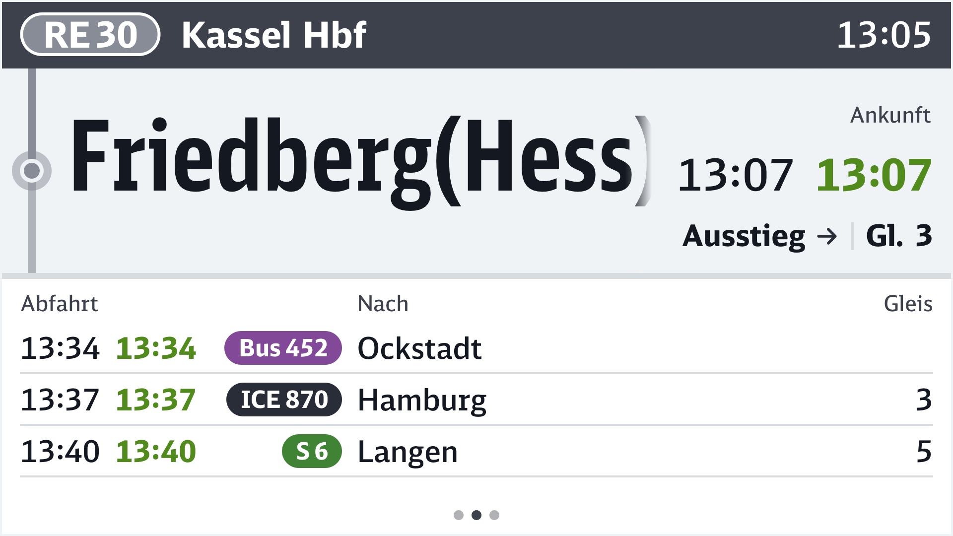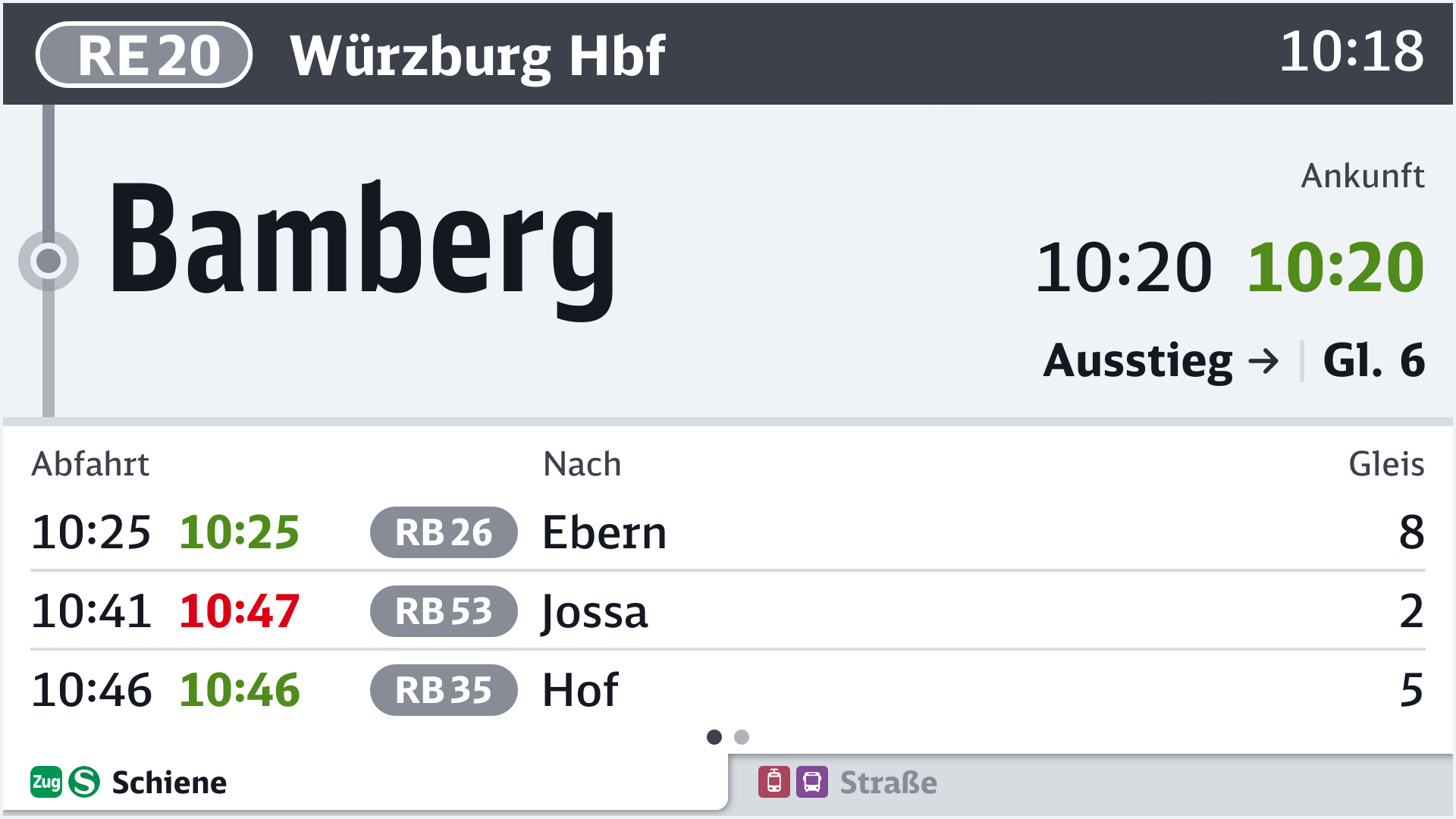 Die verbleibende Zeit bis zur Abfahrt erspart dem Betrachter das Errechnen der Umsteigezeit. Die hier verwendeten Liniensignets sind zusätzlich zu den Produktfarben formunterscheidbar. Dies erhöht die barrierefreie Lesbarkeit des Designs.