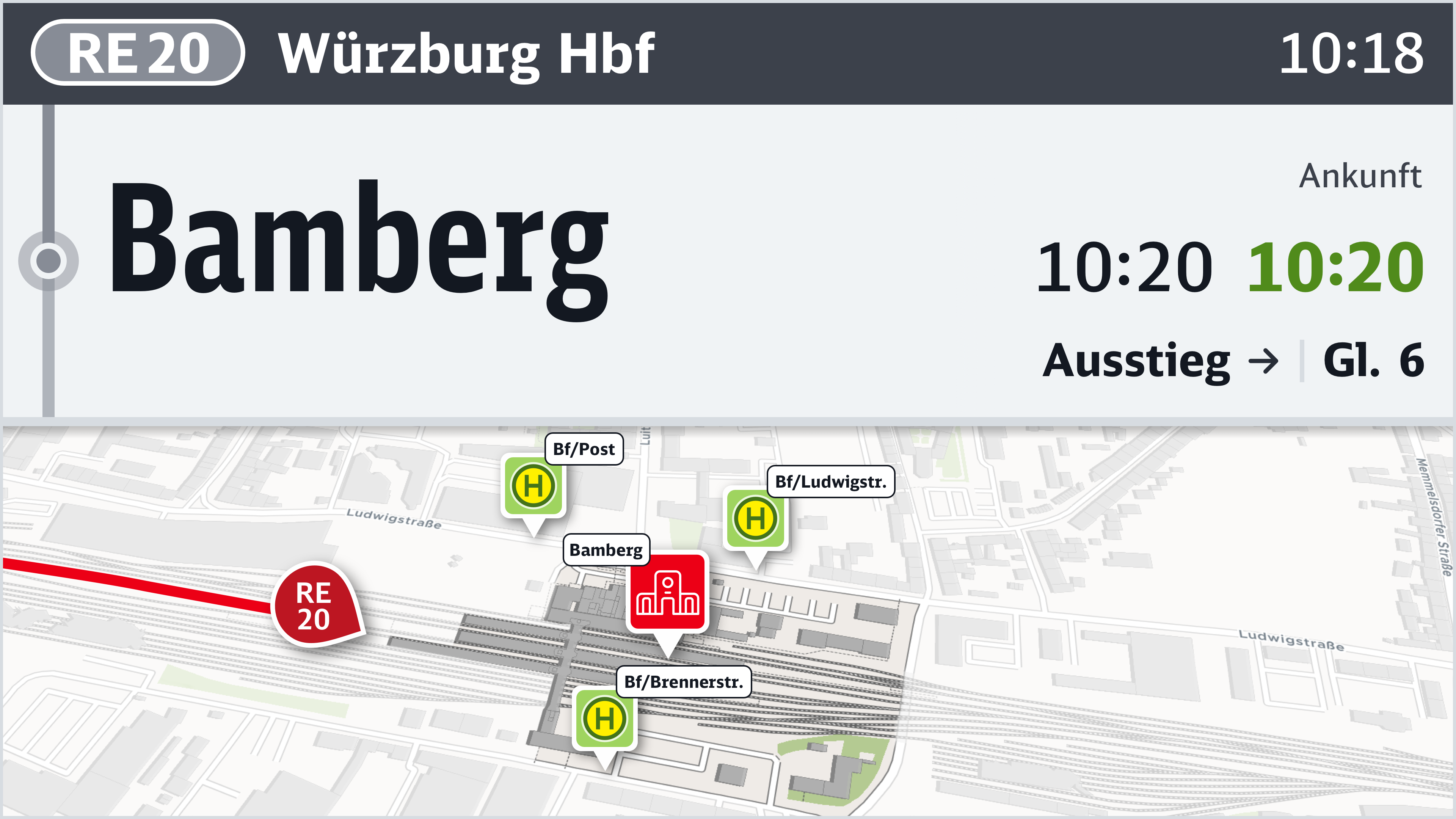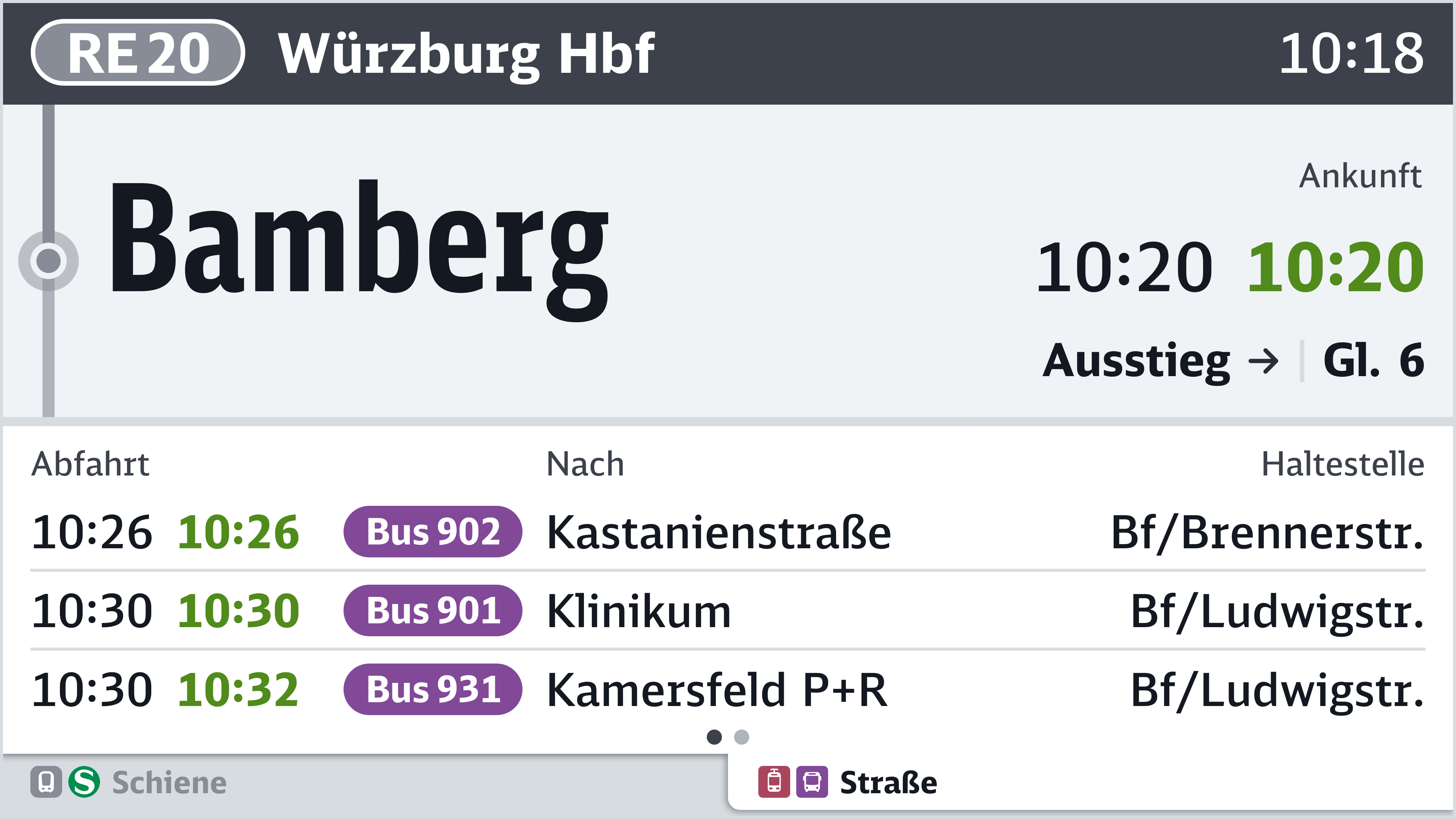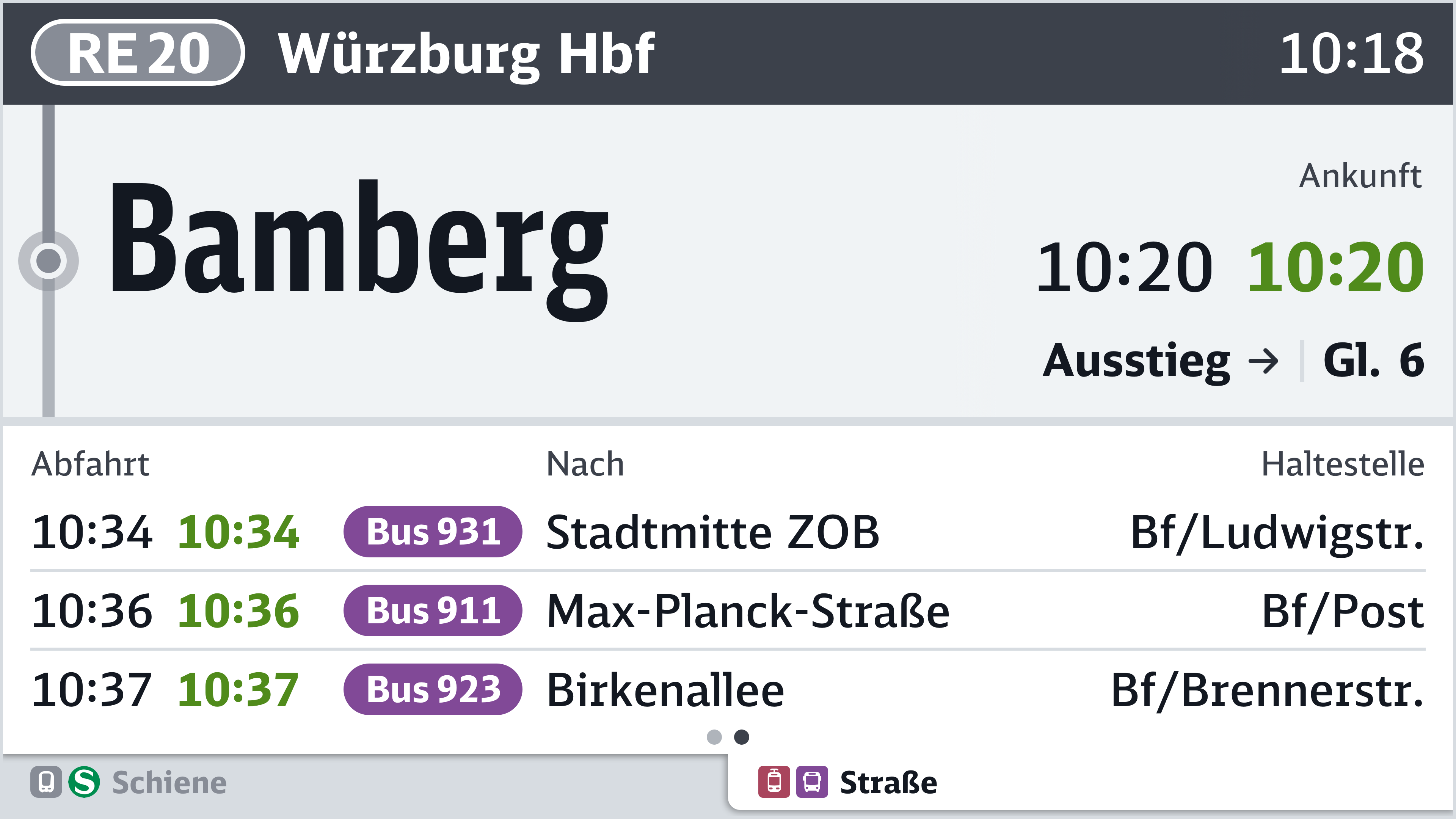 Gibt es an einer Haltestelle keine Anschlüsse, wird weiterhin der Fahrtverlauf angezeigt. Bei Splitscreens können entweder auf beiden Seiten Anschlüsse angezeigt werden oder die Screenfläche wird aufgeteilt: Links der Fahrtverlauf und rechts die Anschlüsse. Letzteres empfiehlt sich vor allem bei kurzen Fahrtabschnitten.