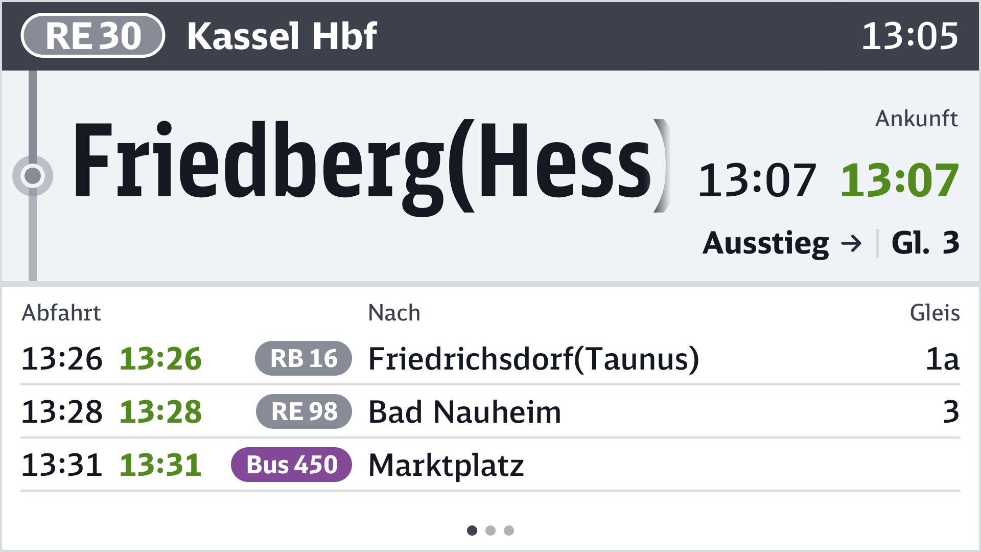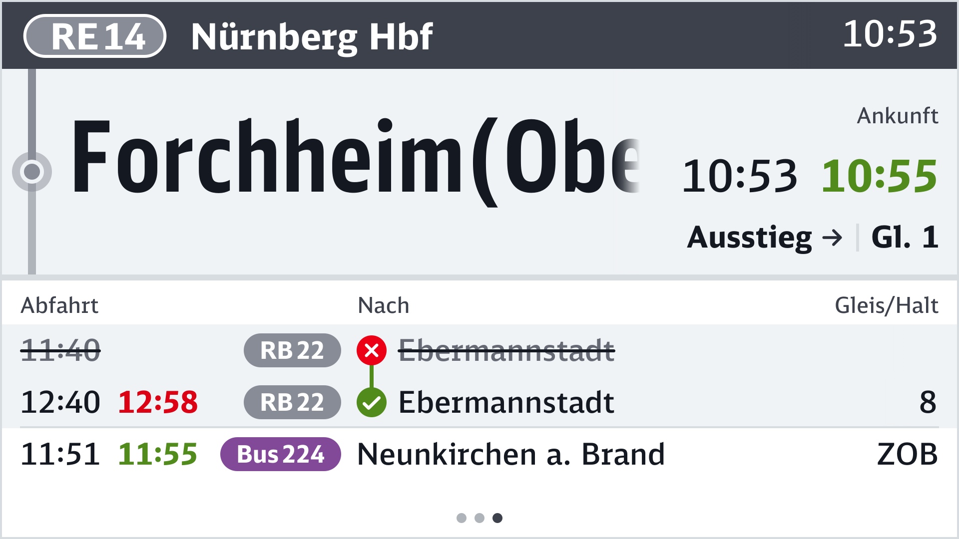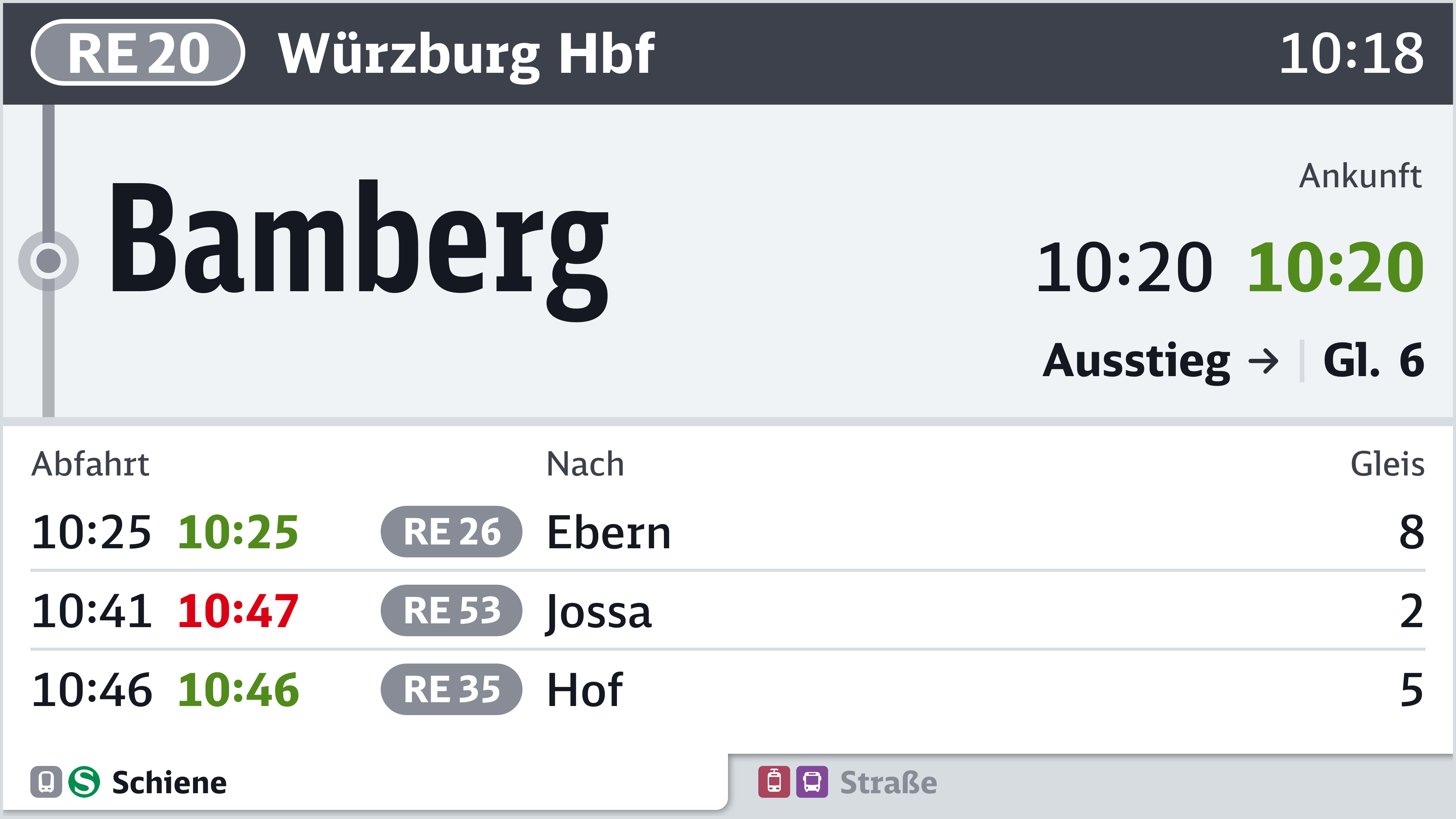 Gibt es an einer Haltestelle keine Anschlüsse, wird weiterhin der Fahrtverlauf angezeigt. Bei Splitscreens können entweder auf beiden Seiten Anschlüsse angezeigt werden oder die Screenfläche wird aufgeteilt: Links der Fahrtverlauf und rechts die Anschlüsse. Letzteres empfiehlt sich vor allem bei kurzen Fahrtabschnitten.