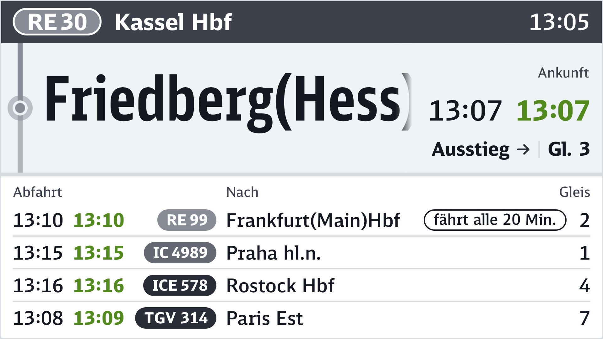 Neben den Basisinformationen, wie Abfahrtszeit mit Prognose und Gleis bzw. Steig, kann die Liste bei entsprechender Datenverfügbarkeit mit weiteren Informationen angereichert werden.