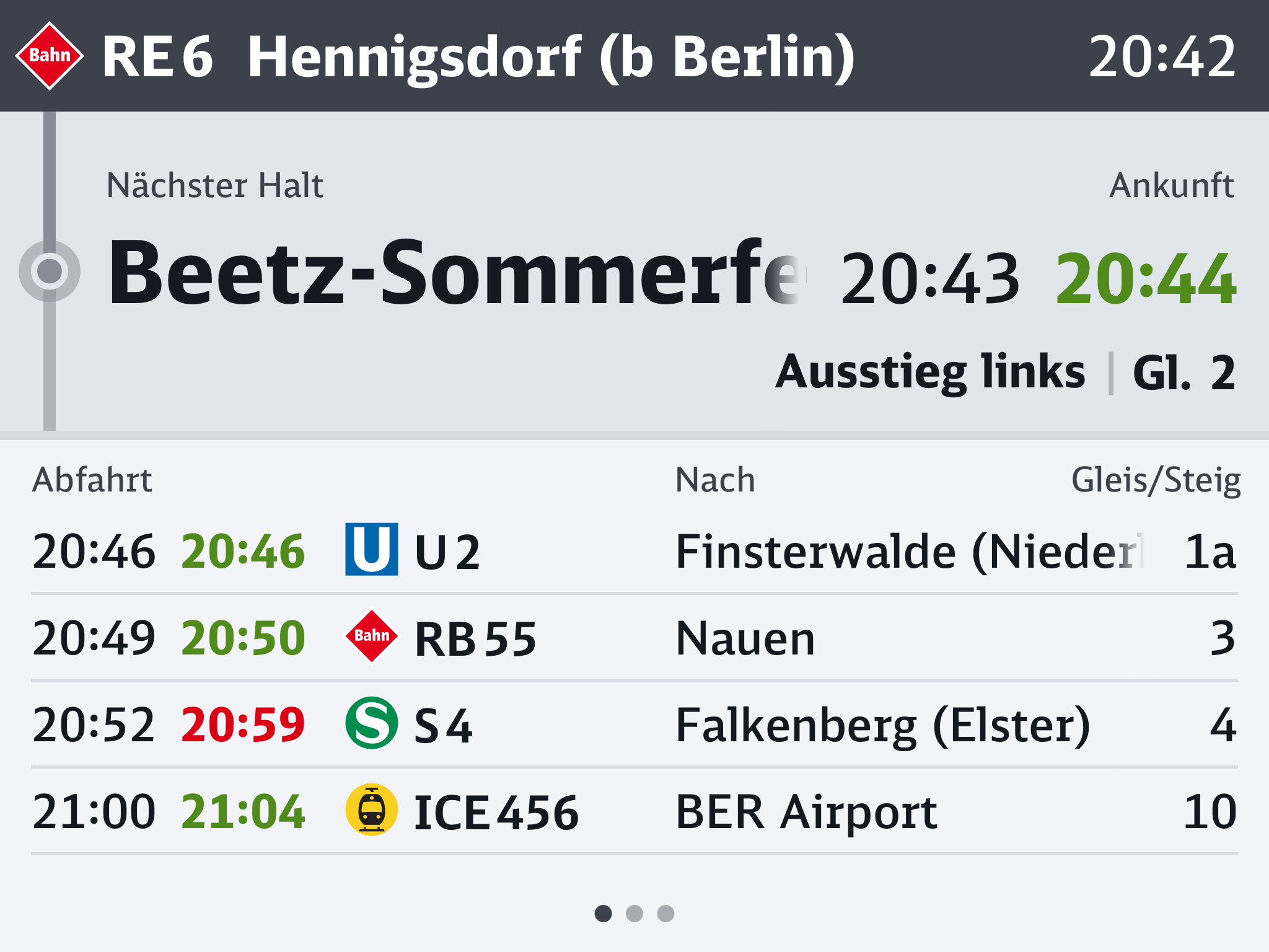 Neben den Basisinformationen wie Abfahrtszeit mit Prognose und Abfahrtsgleis bzw. Steig kann die Liste bei entsprechender Datenverfügbarkeit mit weiteren Informationen angereichert werden. Mehrere Seiten werden durch Paging unterschieden.