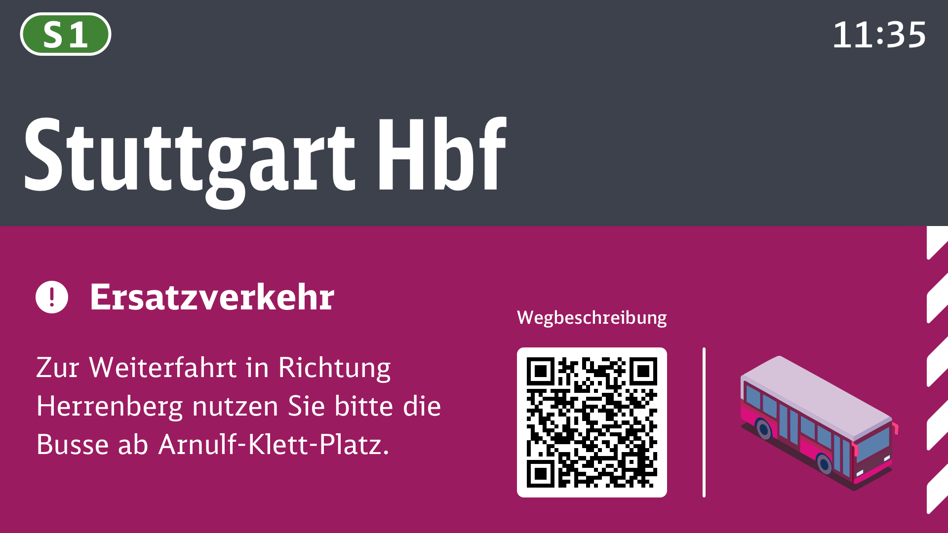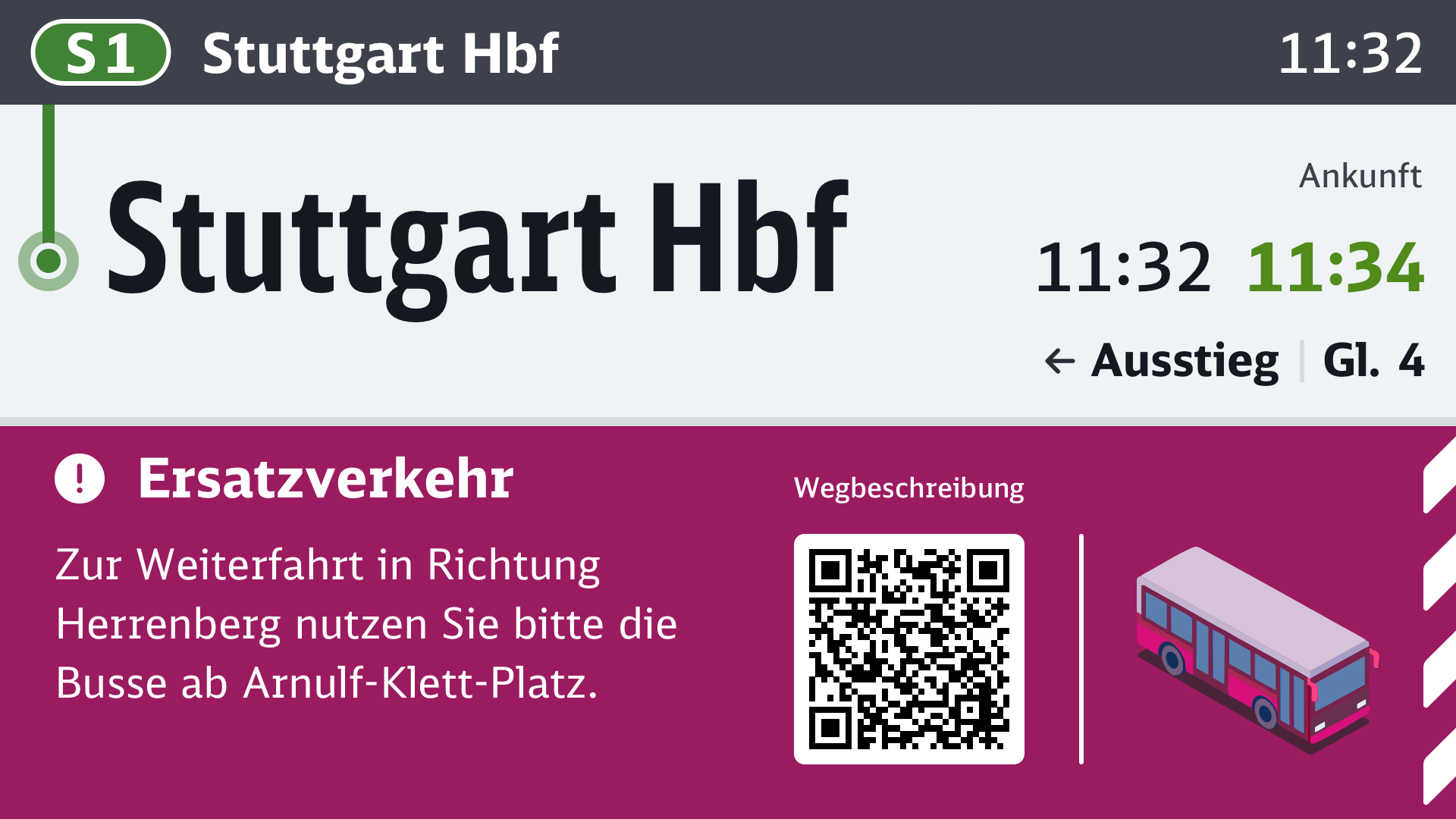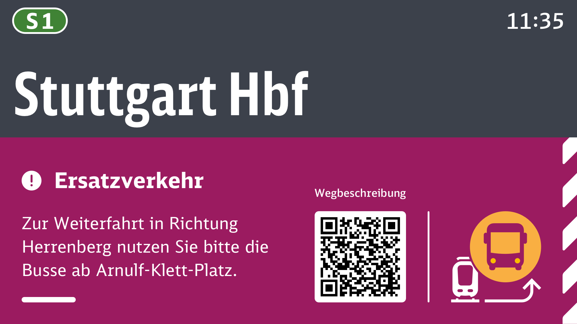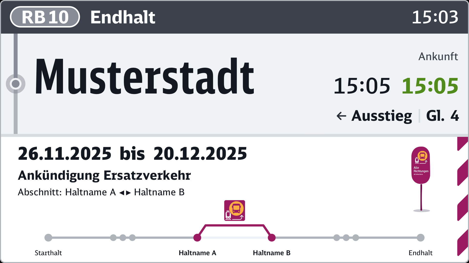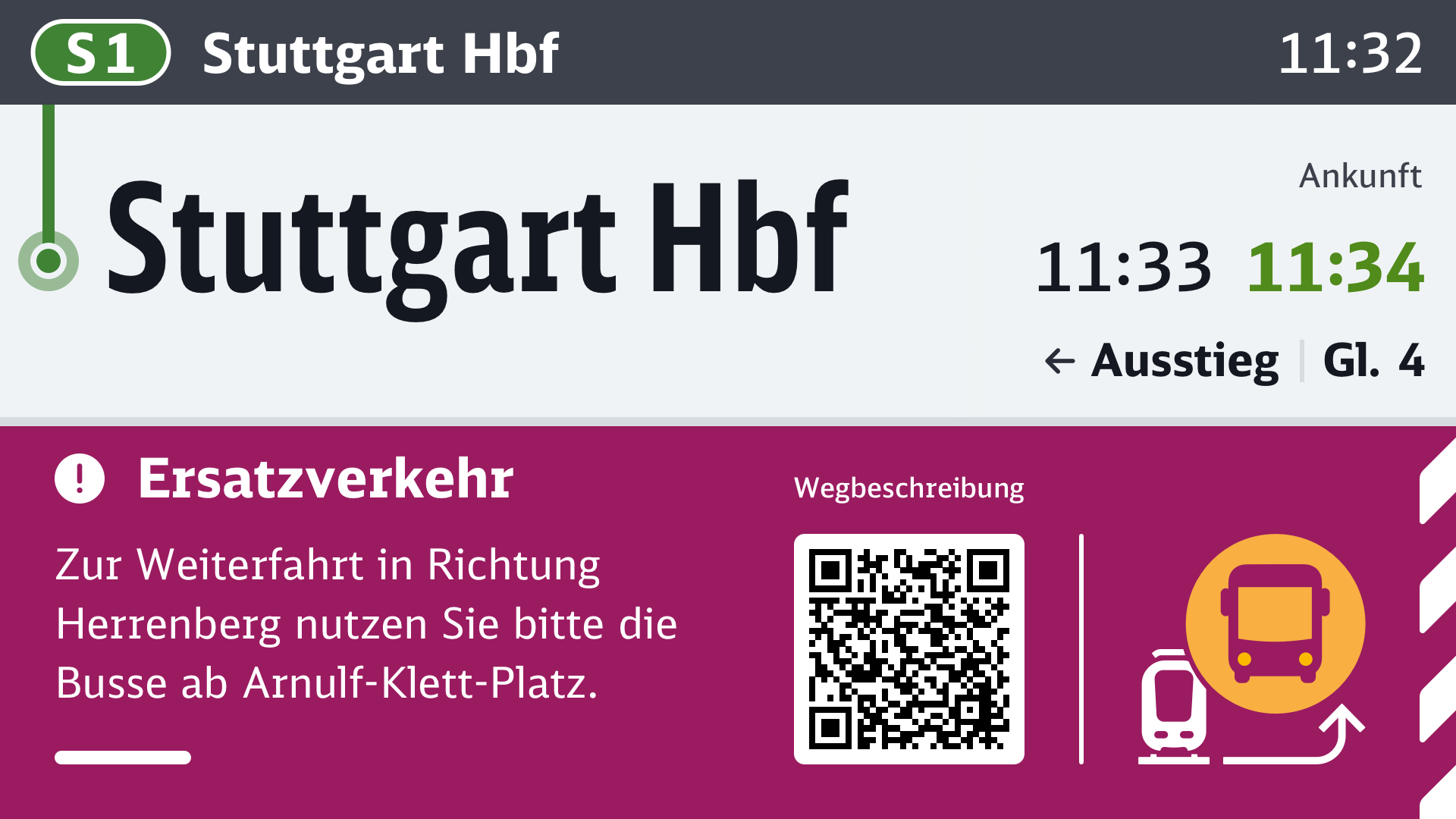 Im Falle eines vorzeitigen Endhalts mit Weiterfahrt im Ersatzverkehr, kann am Tag der Fahrt im Zulauf auf den vorzeitigen Endhalt und bei der Verabschiedung ein Hinweis auf den Ersatzverkehr gegeben werden. Der QR-Code im Beispiel führt zu einer Wegeskizze oder anderen, ergänzenden Informationen.