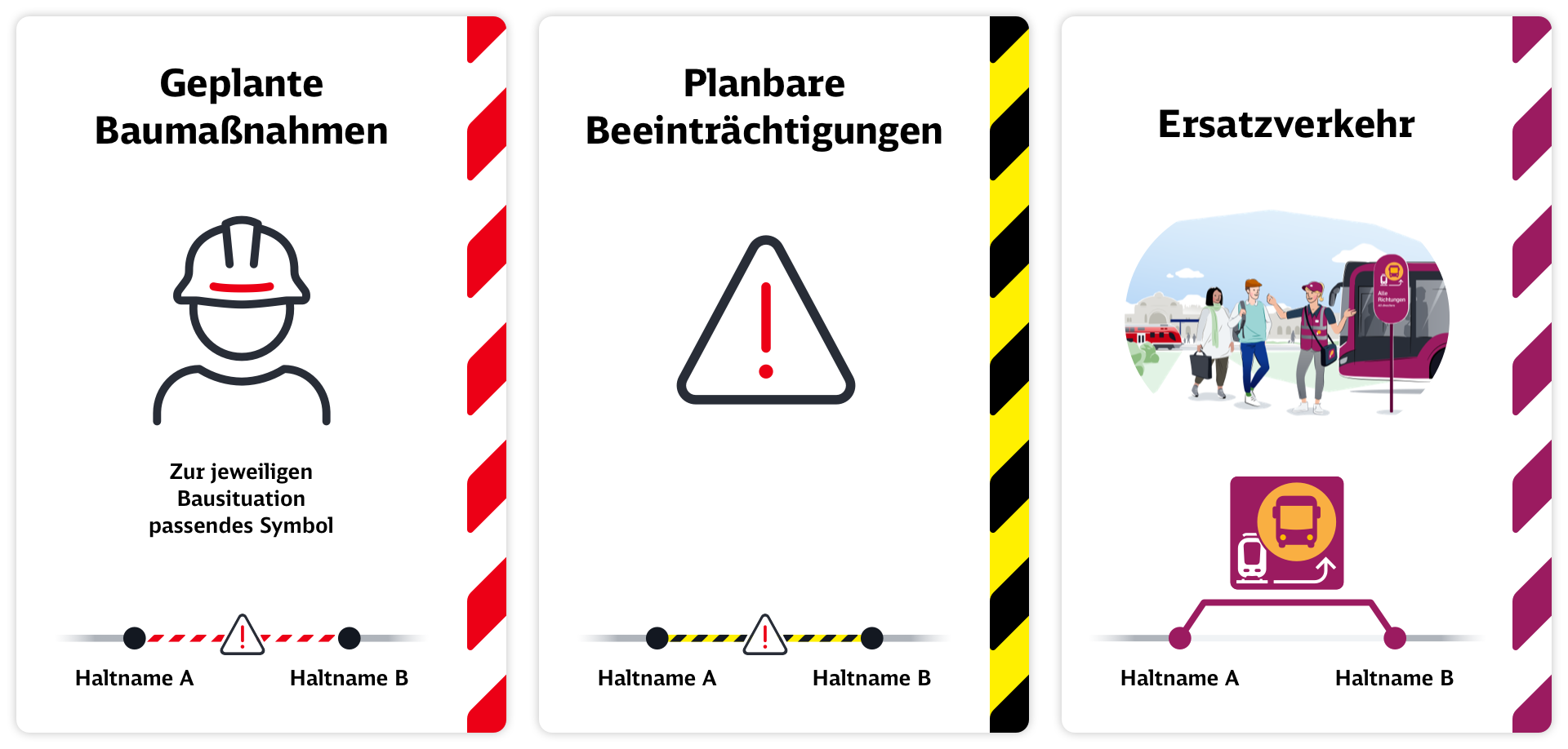 Zusätzlich helfen standardisierte Farbwahl (z. B. Verkehrspurpur im Falle von Ersatzverkehren der Deutschen Bahn) oder andere Gestaltungselemente (Flatterband) den Sachverhalt richtig einzuordnen.