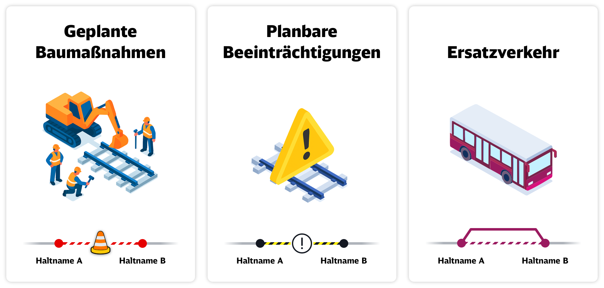 Weiter unterscheiden wir zwischen geplanten Baumaßnahmen und sonstigen, planbaren Beeinträchtigungen und Maßnahmen mit Ersatzverkehr.