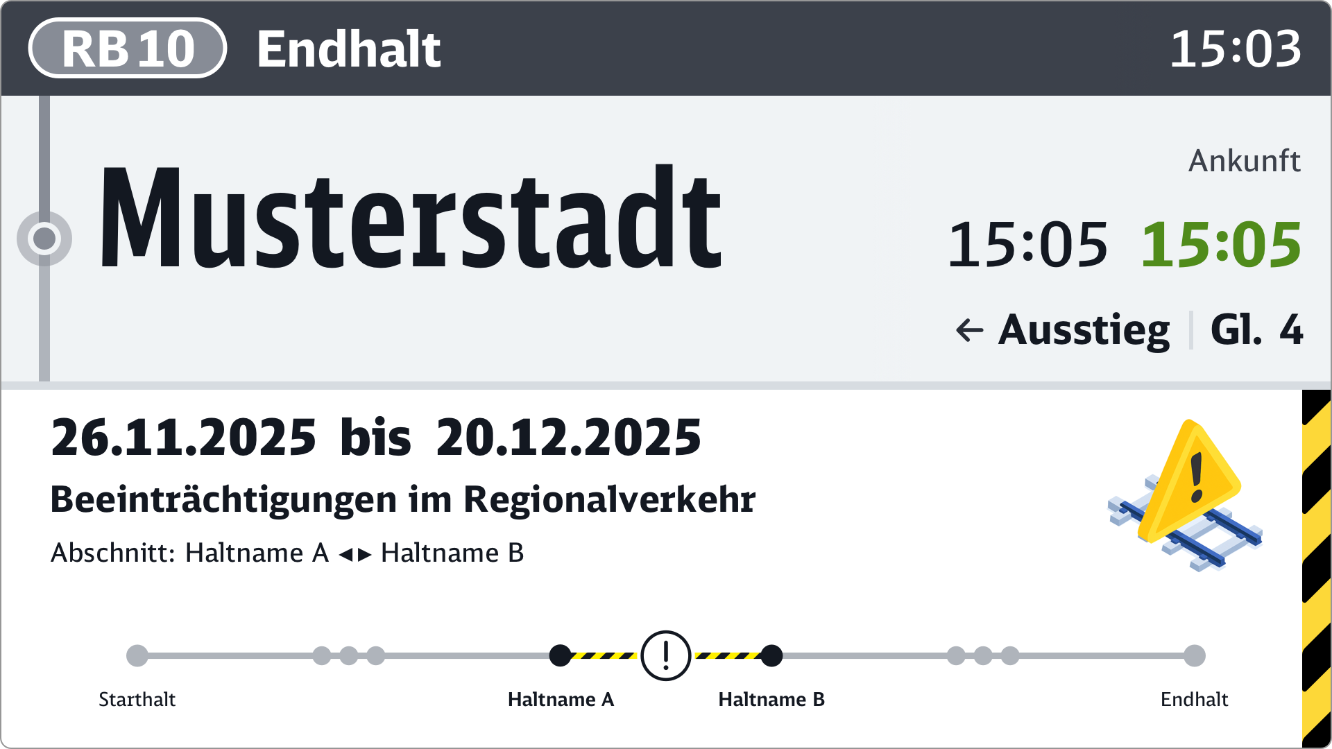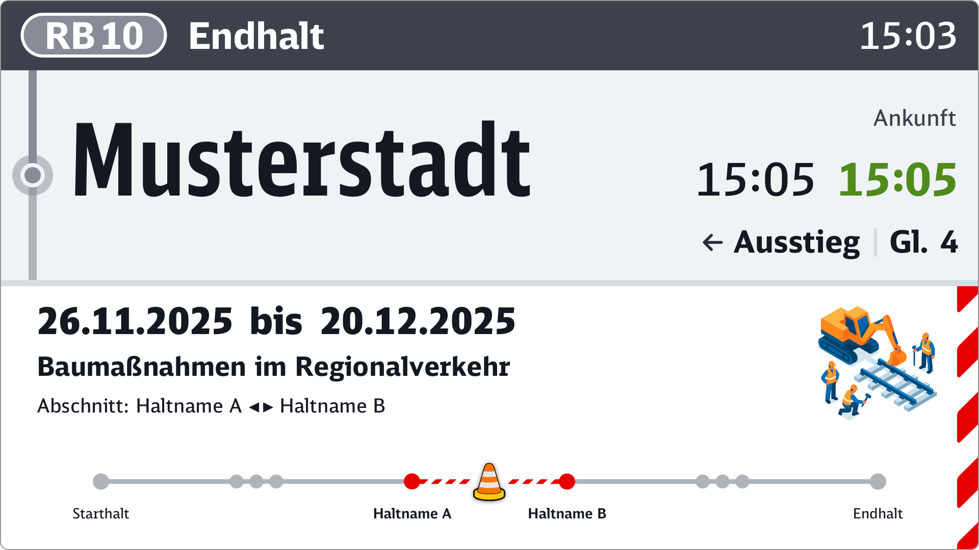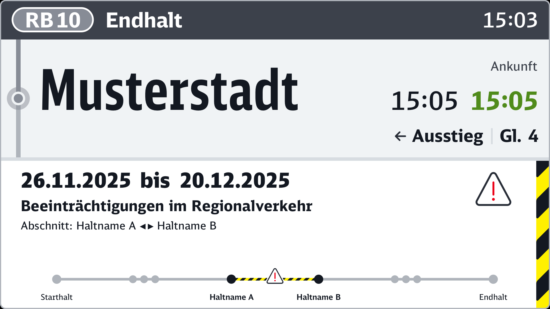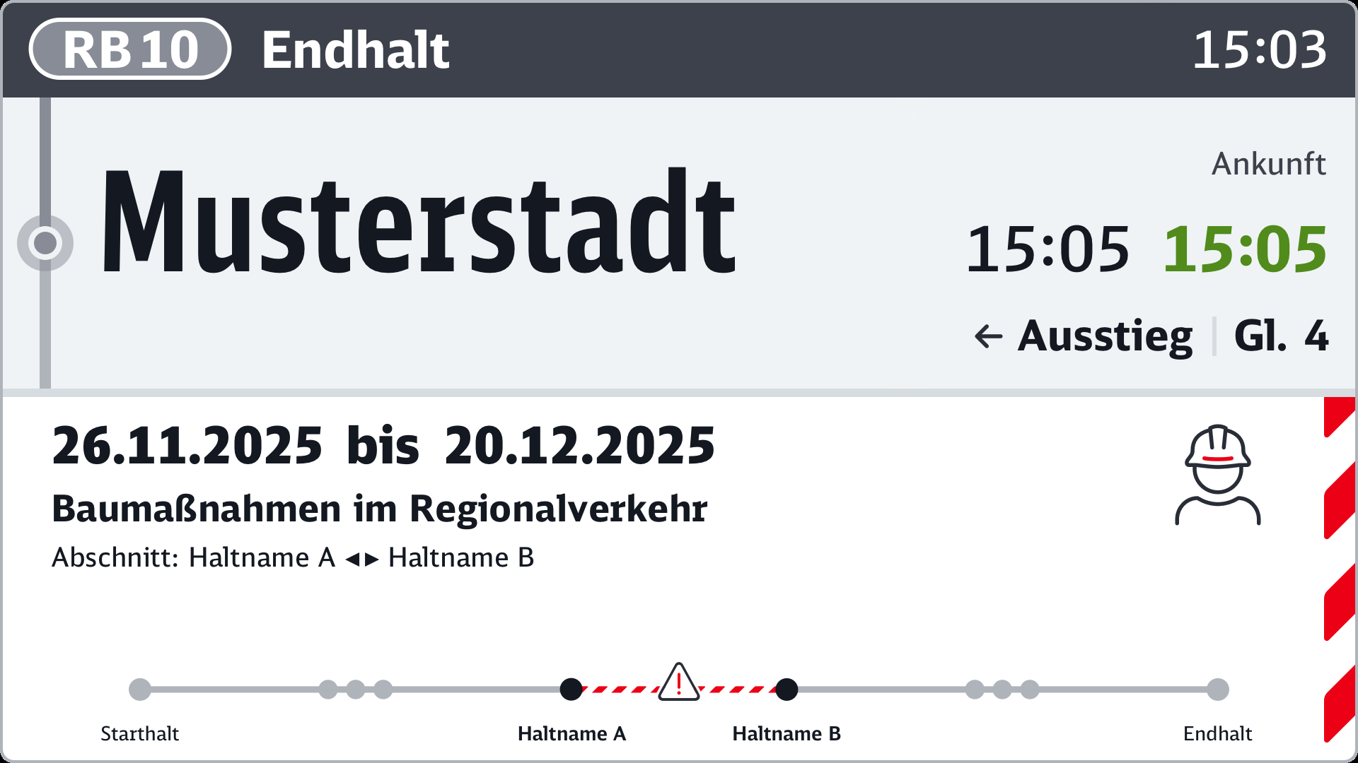 Da in diesem Fall andere Informationen, wie das Fahrtziel oder der nächste Halt, überblendet werden, eignet sich die vollflächige Baustelleninformation nur für lange Fahrtabschnitte. Sie wird zyklisch mit dem Fahrtverlauf oder sonstigen Inhalten eingeblendet.