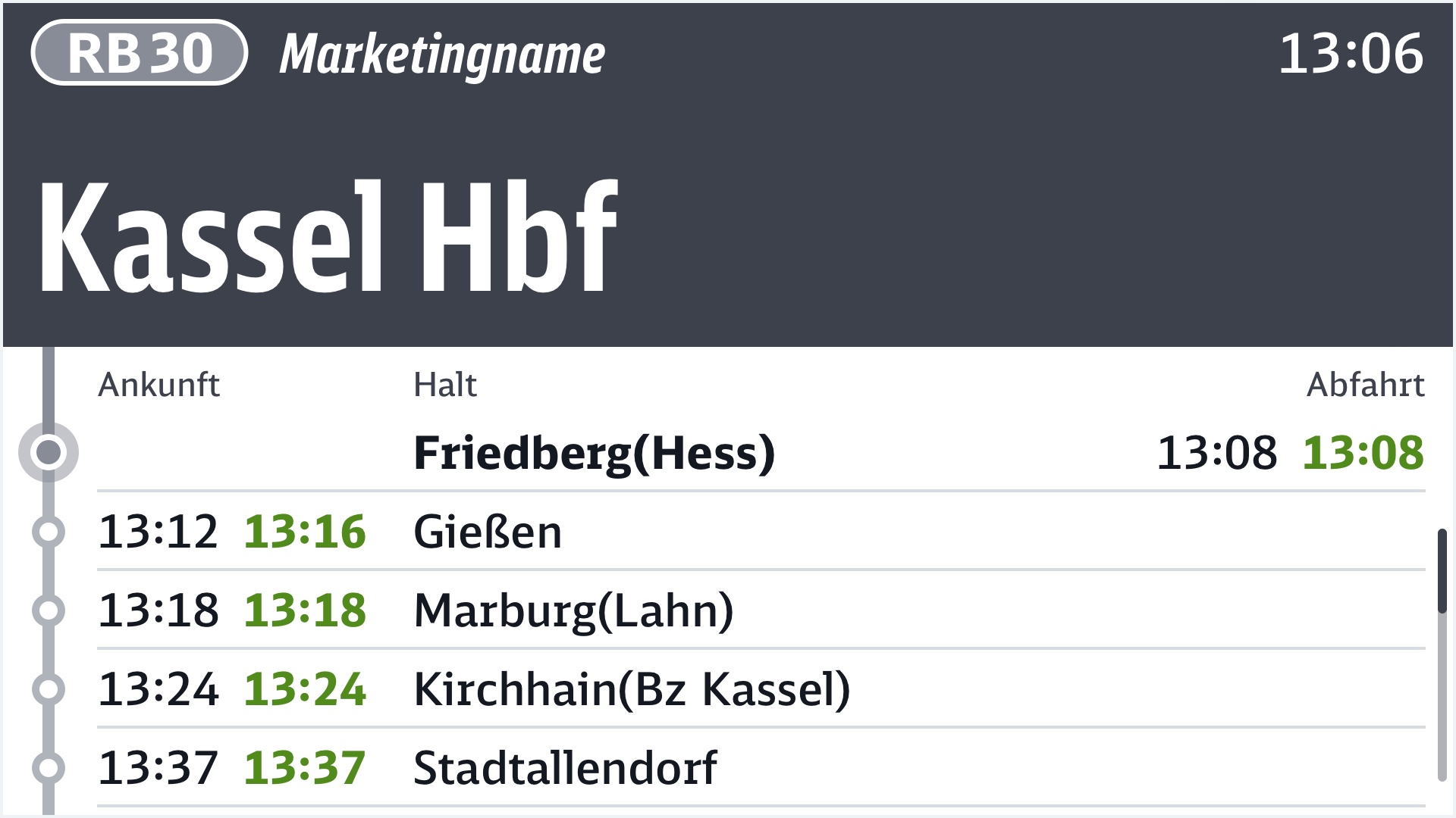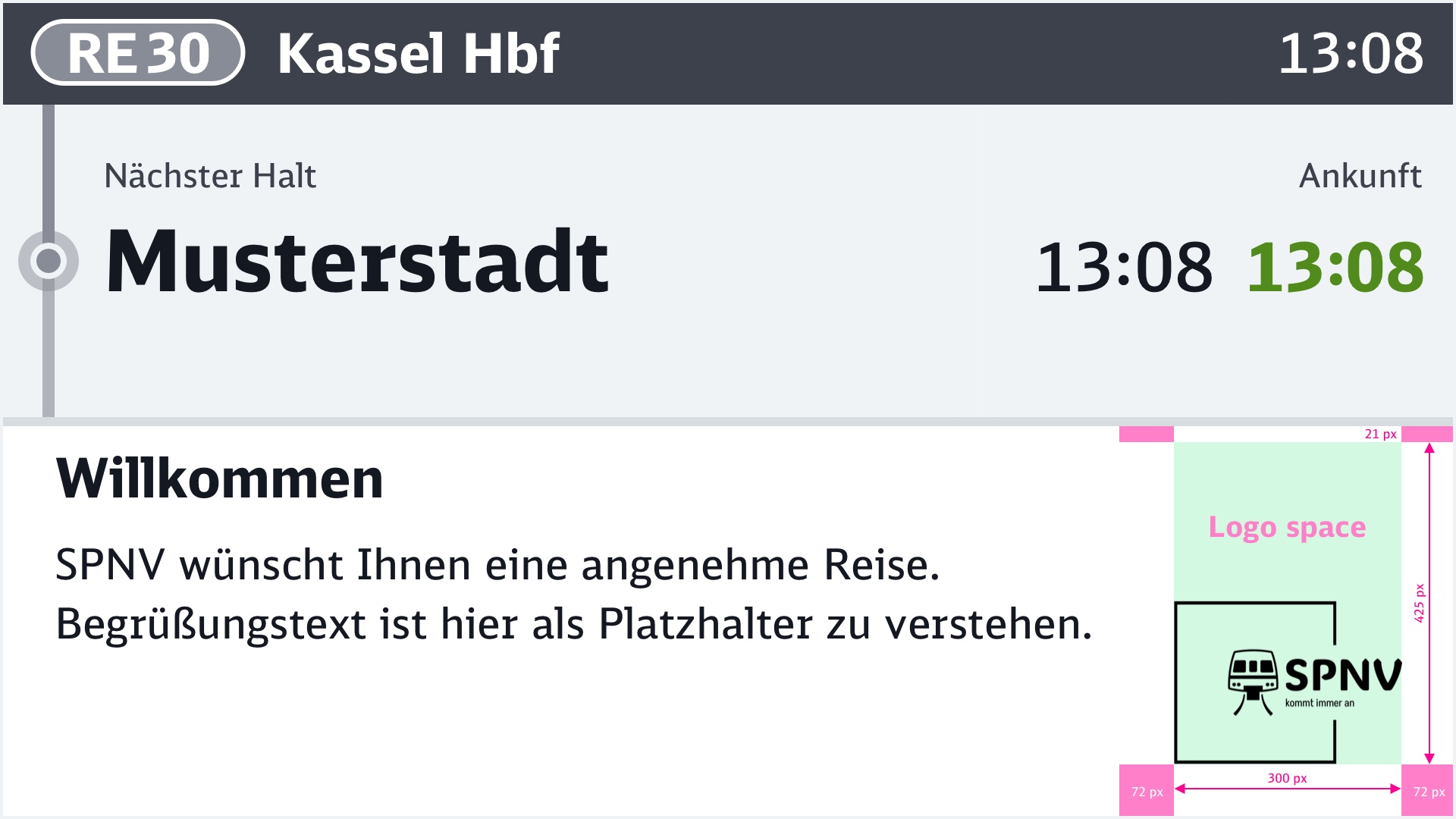 Ein Marketingname kann die Wiedererkennung einer Linie erhöhen oder regionalen Bezug herstellen. Er sollte aber nicht im Vordergrund stehen, um Platz für wichtigere Informationen auf Bildschirmen zu lassen. Meist taucht er auch an anderen Stellen im Fahrzeug (Anschrift, Teilnetzplan ...) auf, sodass ein Ausspielen im großzügig gestalteten Bereich des Fahrtziels im Halt völlig ausreicht.