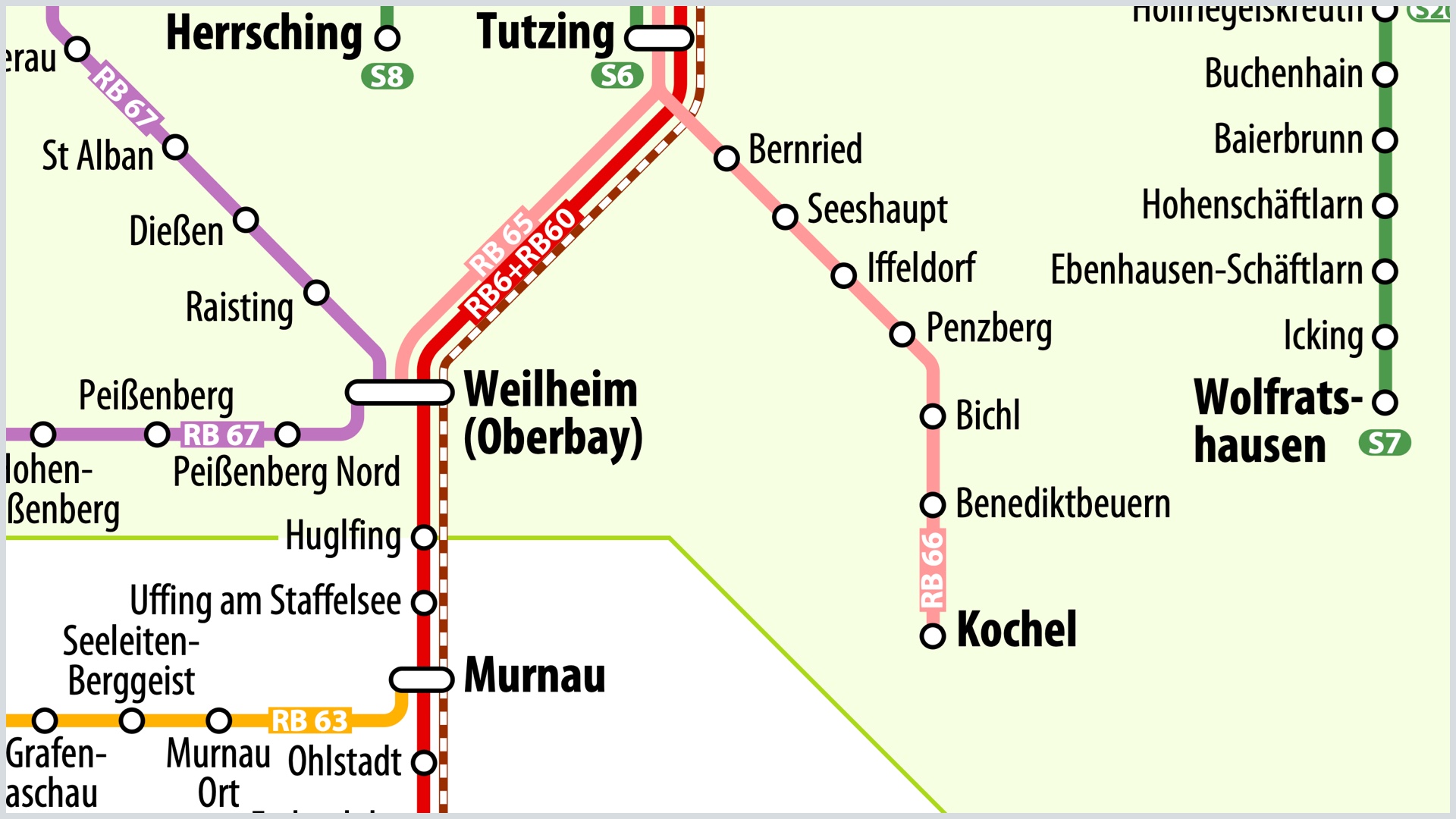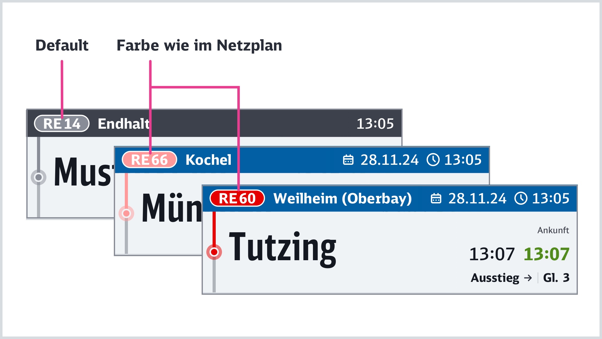 - Produktspezifische Standardfarben als Alternative (z. B. grün für S-Bahnen, blau für U-Bahnen)