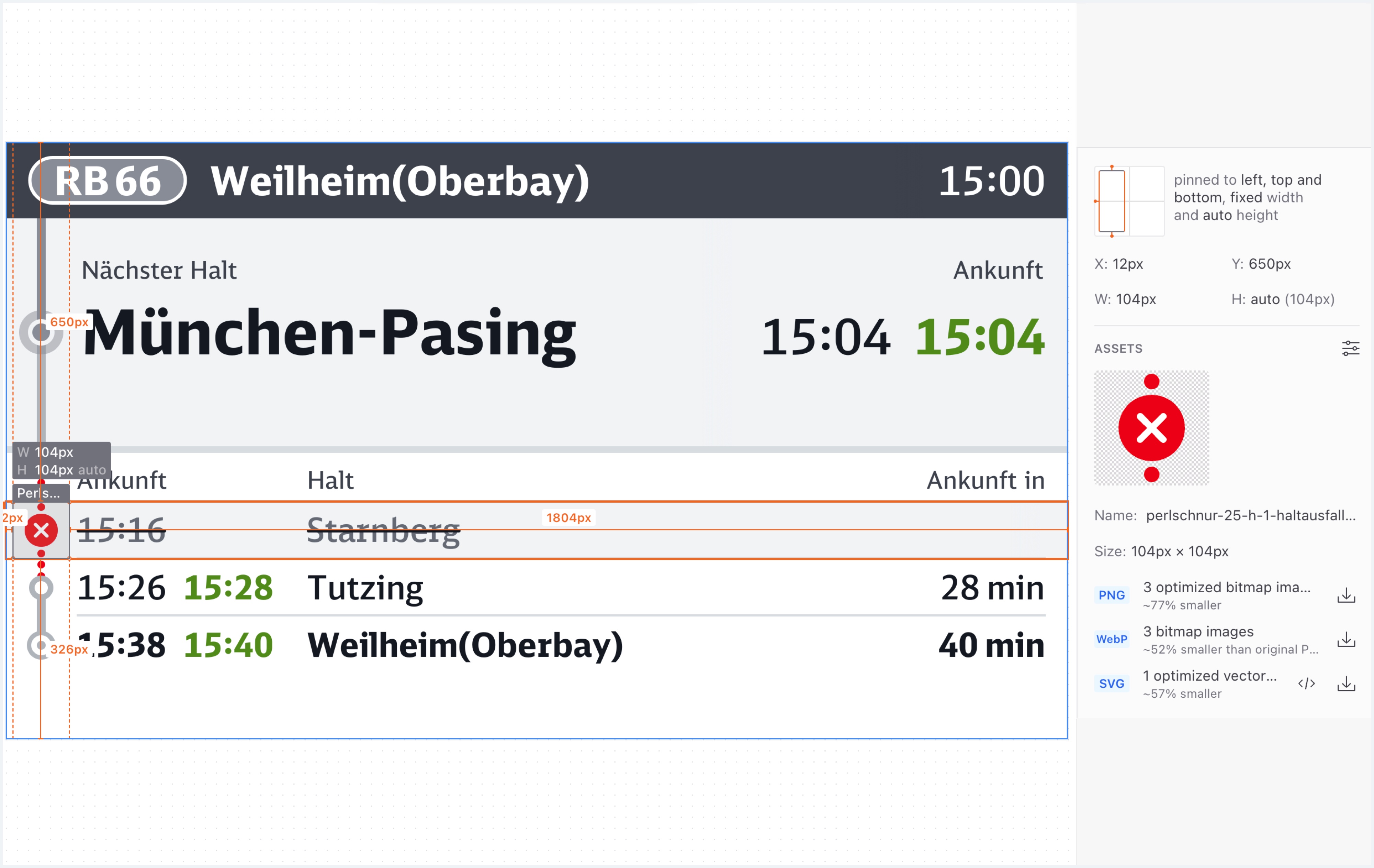 Der Zugriff erfolgt mittels eines webbasierten Übergabetool. Dieses Tool ermöglicht es den Entwickler:innen, die dargestellten Beispiele nicht nur als Bilder herunterzuladen, sondern auch die Bemaßung und Farbcodes einzelner Elemente auszulesen, um den Inhalt präzise nachzubauen. Darüber hinaus können gesamte Assets, wie Piktogramme und Schrifttypen, direkt aus dem Tool heruntergeladen werden, um eine möglichst genaue Umsetzung der Gestaltung sicherzustellen.