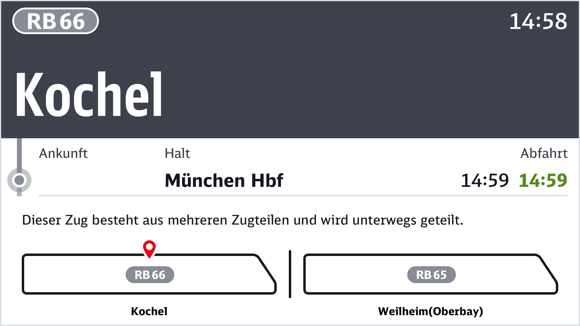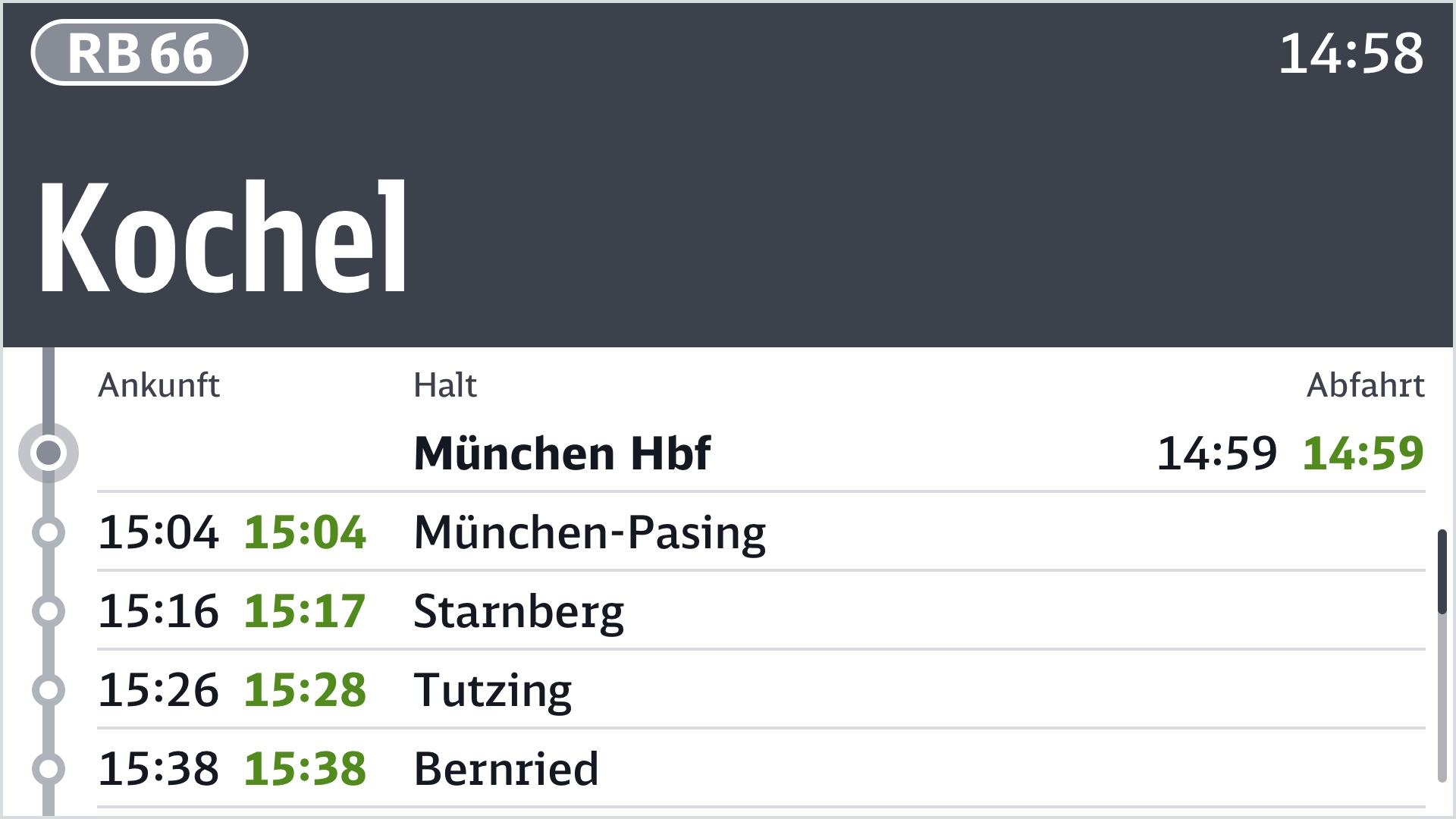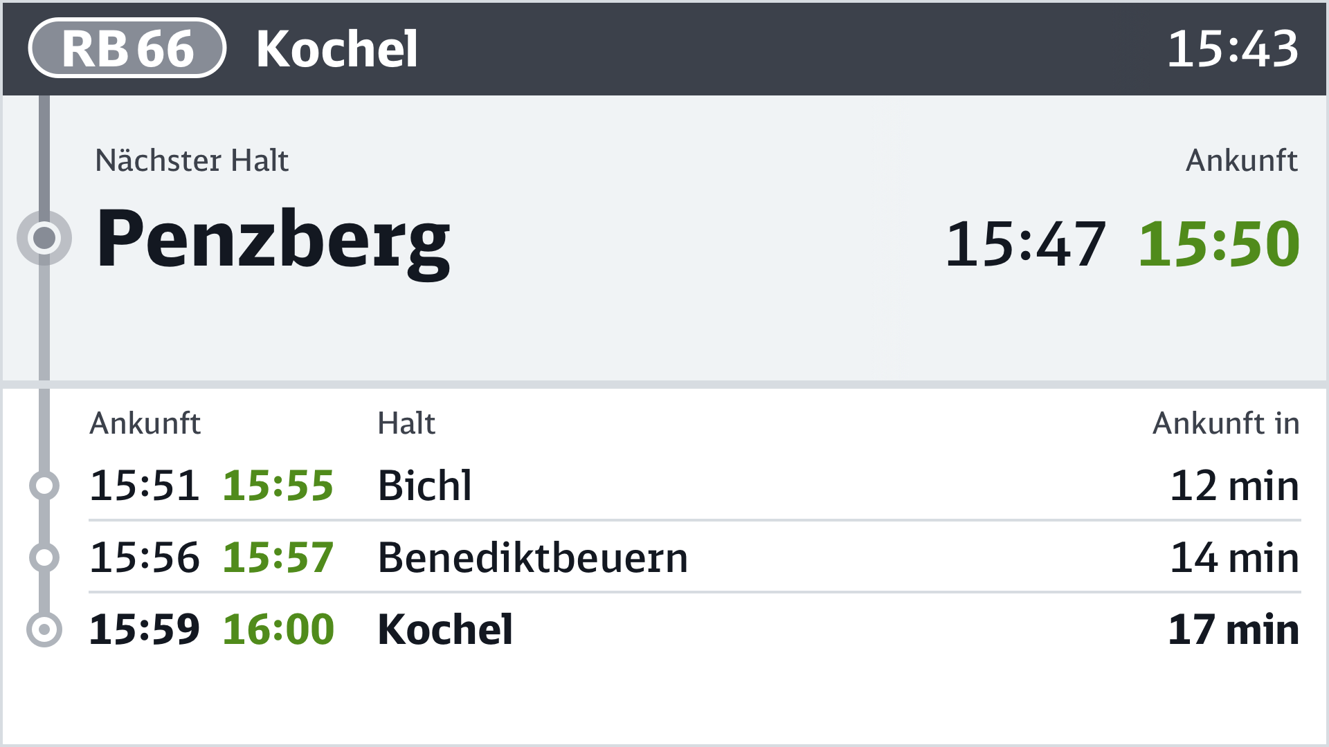 Zweitrangig und daher kleiner dargestellt ist die Abfahrtszeit am aktuellen Halt und der weitere Fahrtverlauf.