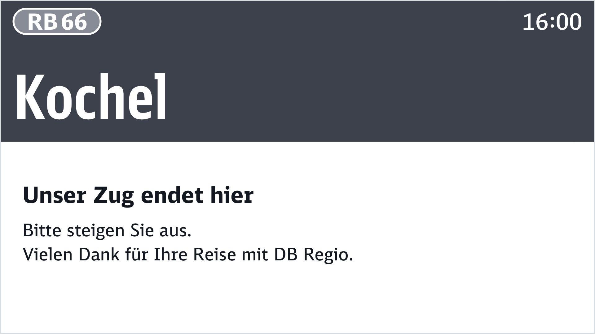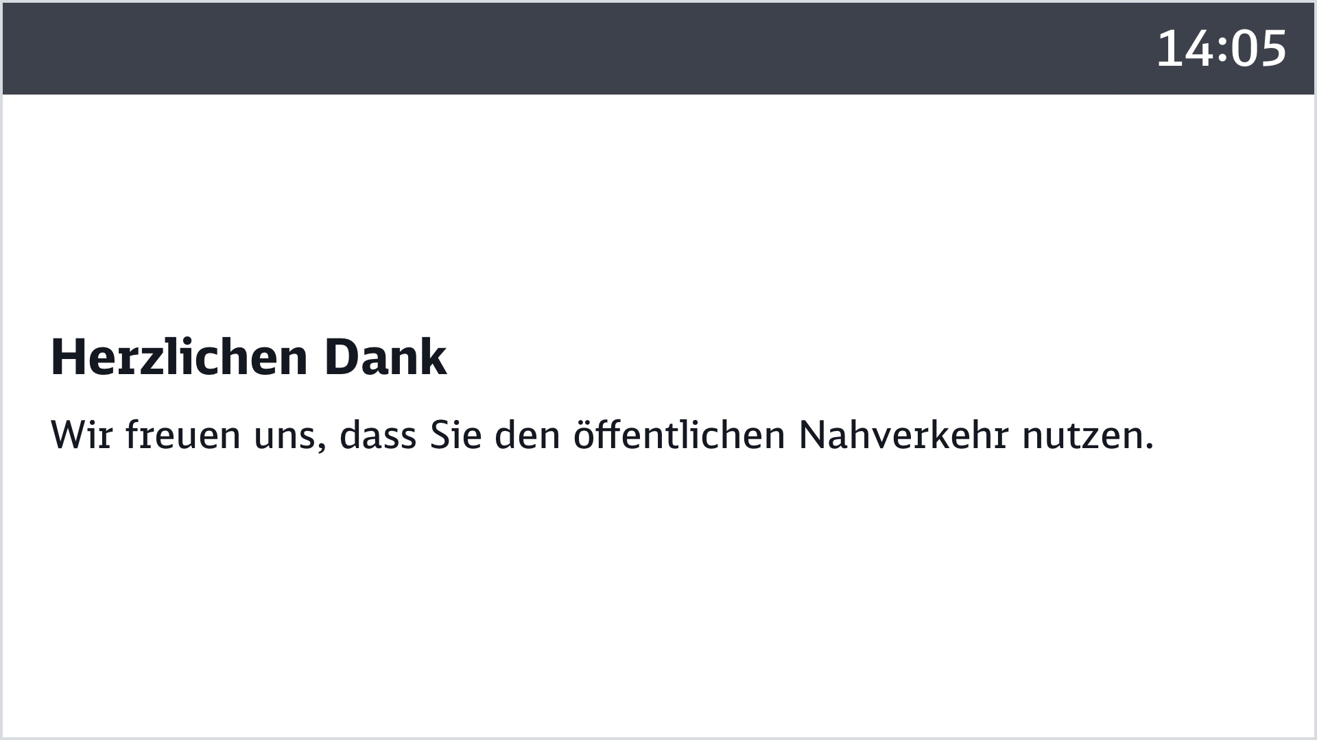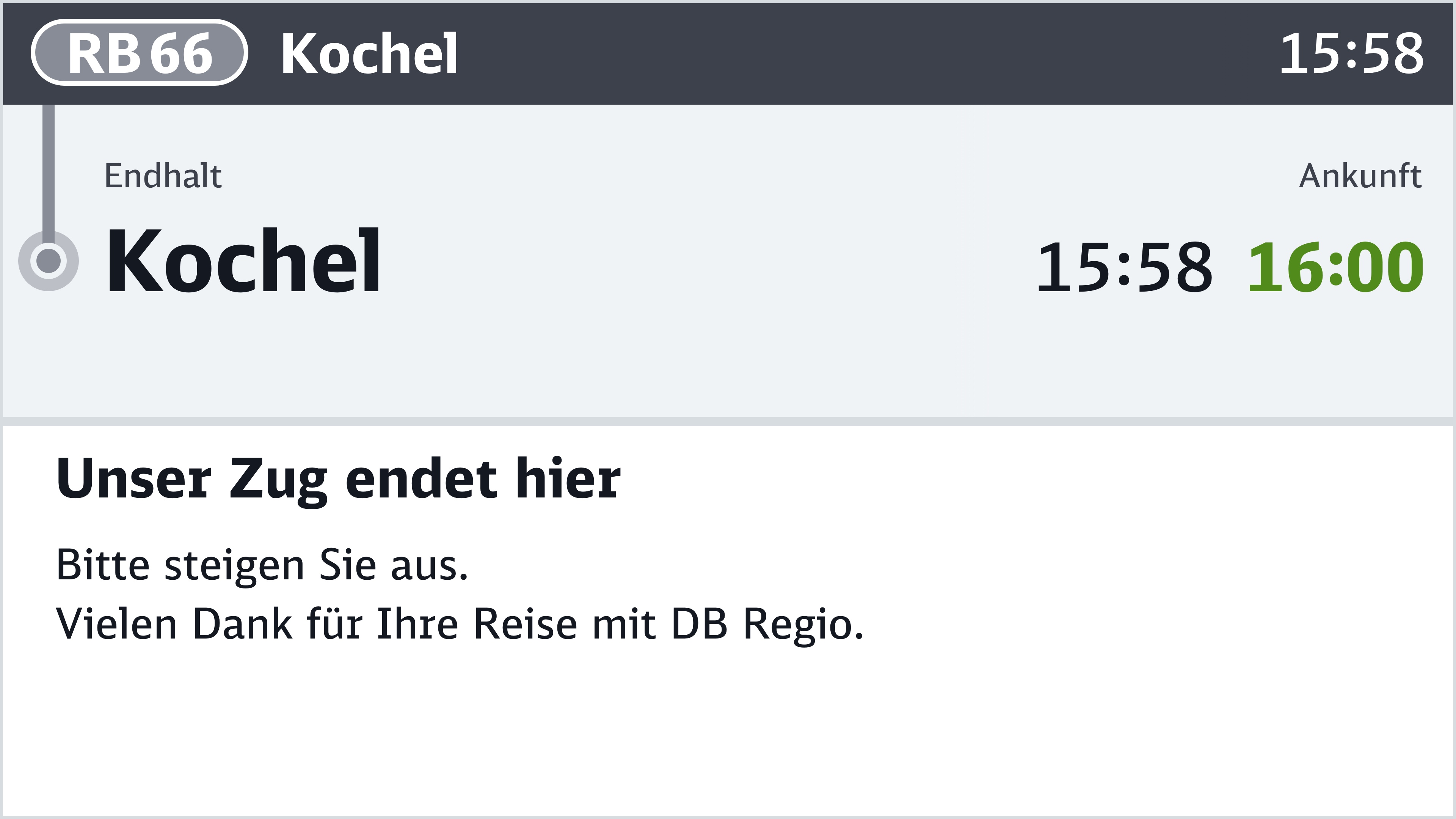 Bereits im Zulauf auf den Endhalt wird ein Hinweis auf Fahrtende mit Verabschiedung eingespielt.