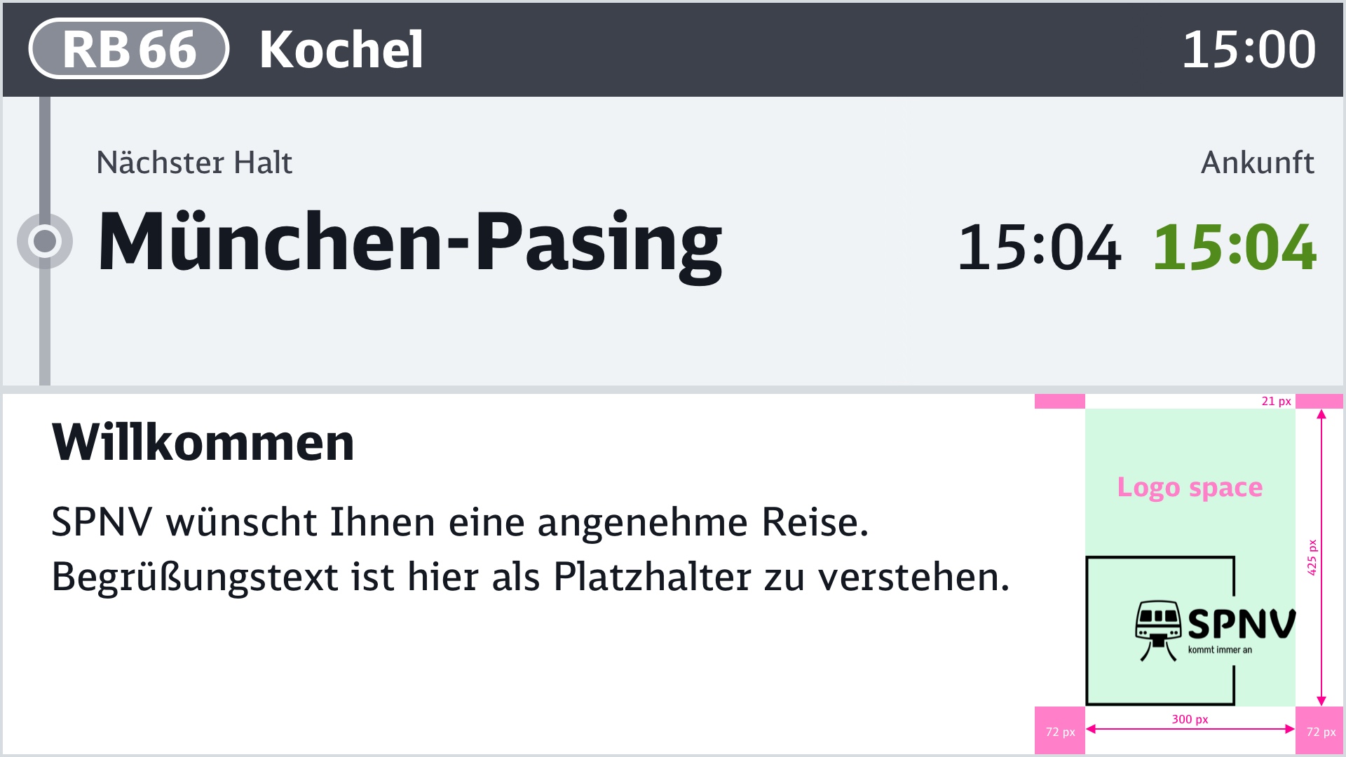 Alternierend zum Fahrtverlauf, kann eine Begrüßung eingeblendet werden. Reisende, die noch ohne Sitzplatz sind interessieren sich für die Auslastung.