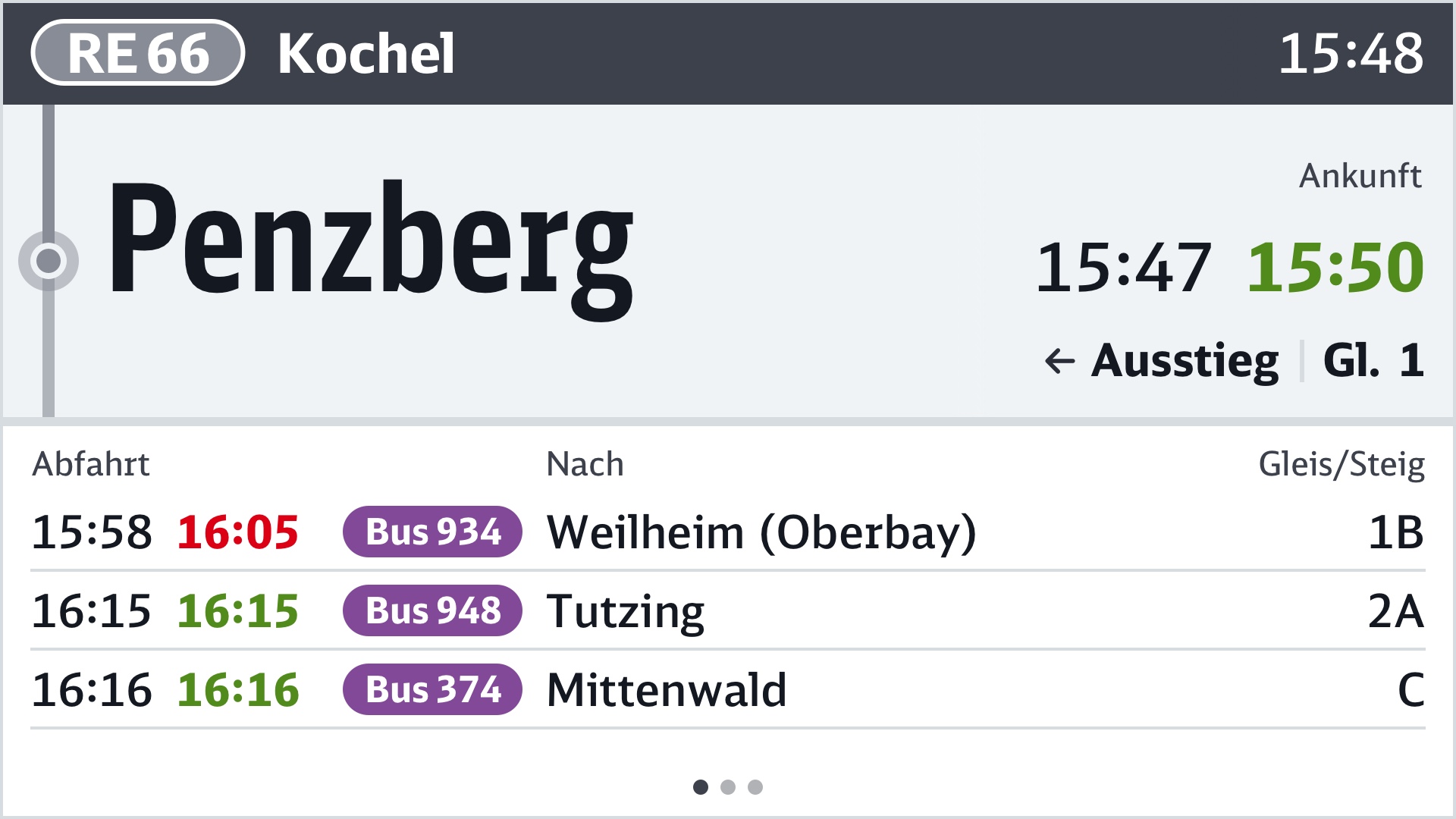 In dieser Phase wird der Name des nächsten Halts mit geplanter und prognostizierter Ankunftszeit besonders groß angezeigt. Im Bahnverkehr ein Erfordernis der TSI-PRM.